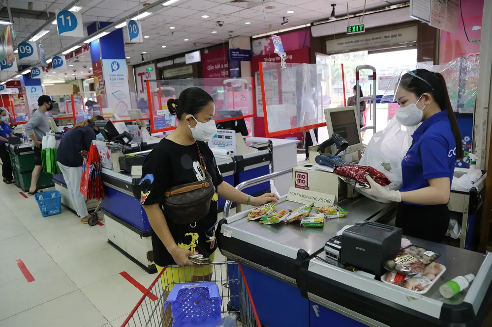 Khu vực tính tiền thưa thớt khách, người dân và nhân viên siêu thị luôn đảm bảo khoảng cách phòng dịch.