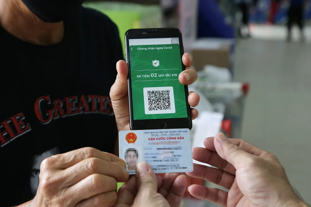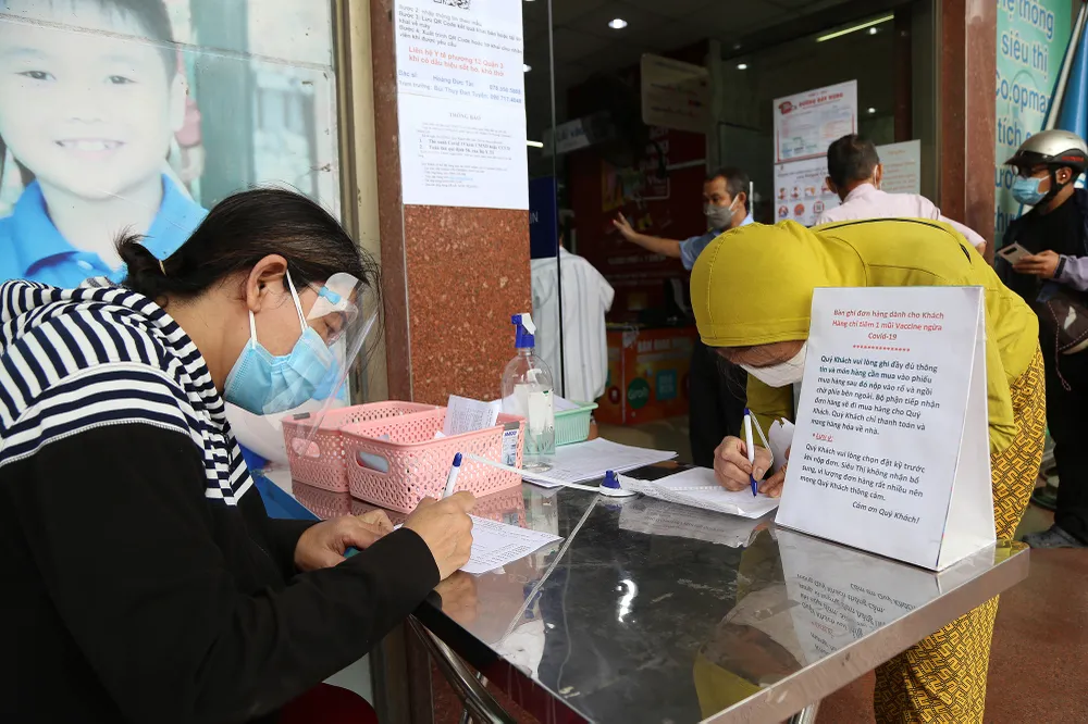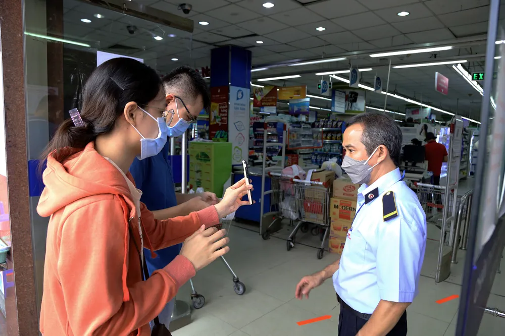 Tại siêu thị Co.opmart Nhiêu Lộc (quận 3), để được vào trong mua hàng người dân bắt buộc phải thực hiện khai báo y tế và xuất trình thẻ xanh COVID-19 (tiêm đủ 2 mũi vaccine).