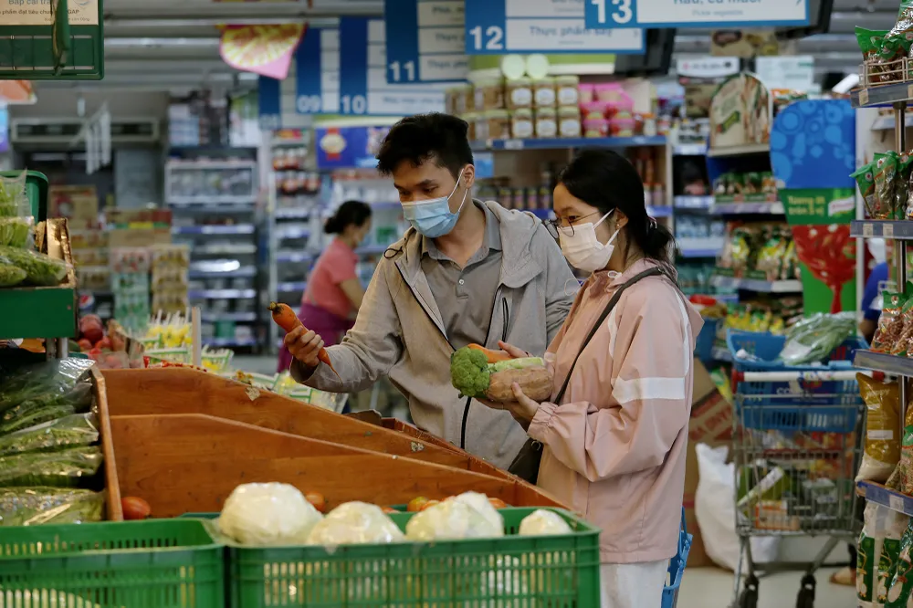 Các bạn trẻ có thẻ xanh COVID-19 tranh thủ đến siêu thị để mua hàng trong buổi chiều tan làm.