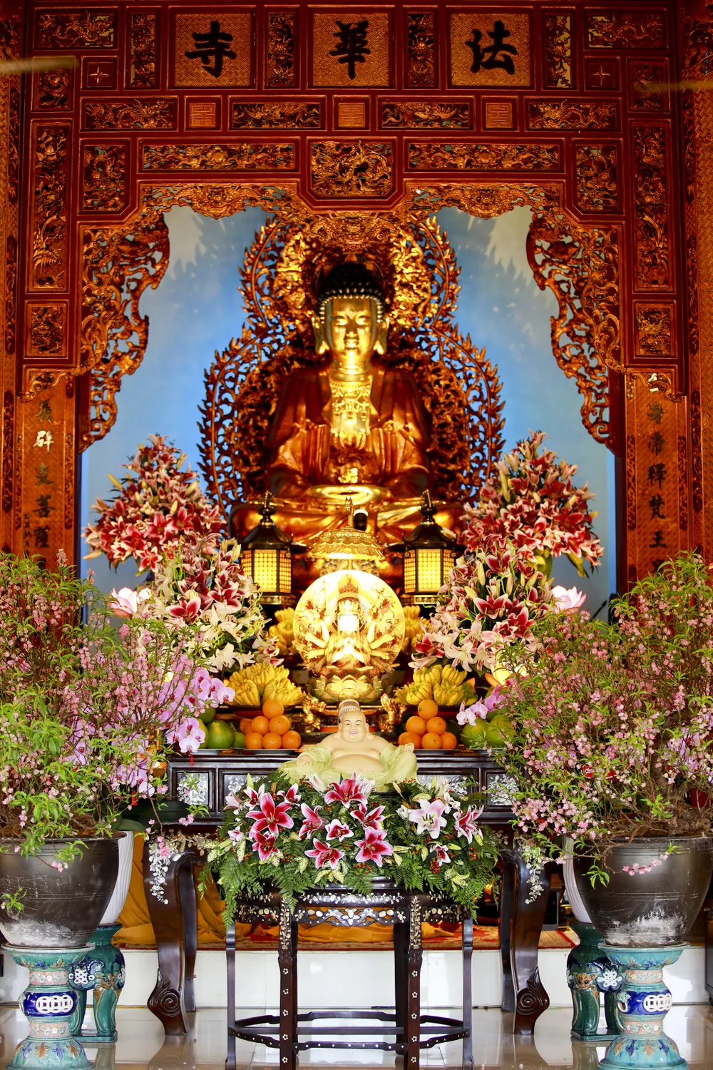 Bàn thờ phật tại chùa Pháp Hoa trang trọng với nhiều hoa tươi.