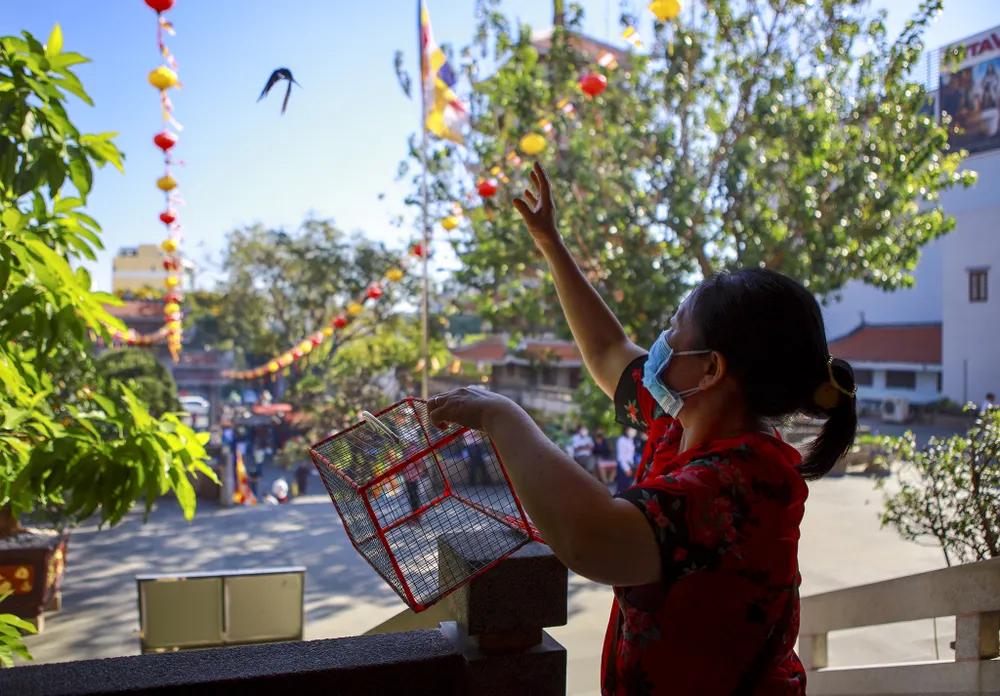 Ngoài dân hương, lễ Phật người dân còn mua chim phóng sinh.