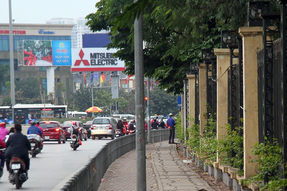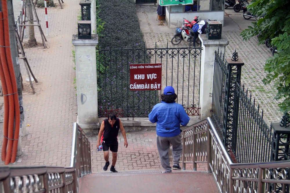 Đây là tấm biển tại chân cầu đi bộ, cạnh Công viên Thống Nhất, tấm biển có nội dung "Cấm đái bậy" nhằm nhắc nhở người qua lại giữ gìn vệ sinh chung.