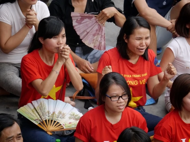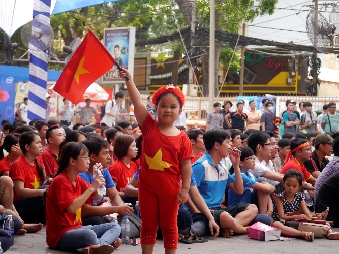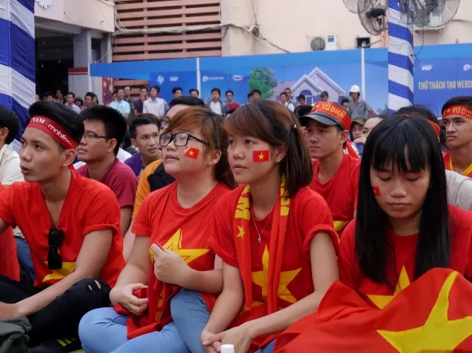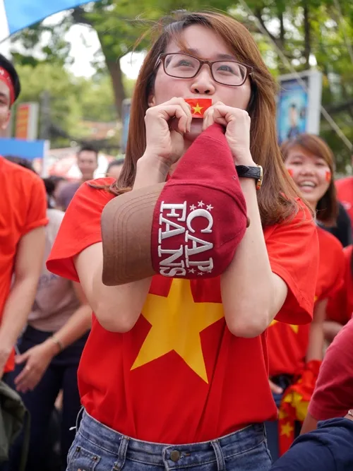 Các fan nữ khoác trên mình những chiếc áo cờ đỏ sao vàng cùng những băng rôn cổ vũ khiến không khí trở nên nóng bỏng
