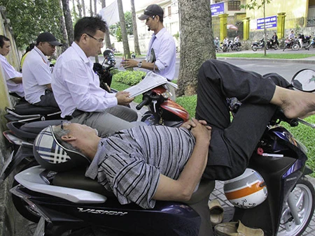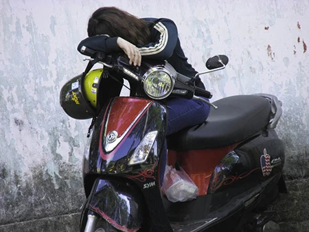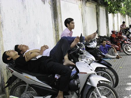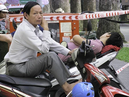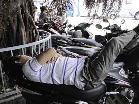 Nhiều phụ huynh ngủ ngay trên yên xe để vừa ngủ vừa không sợ mất xe - Ảnh: Phước Tĩnh