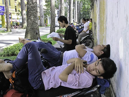Dưới đây là chùm ảnh phóng viên Pháp Luật TP. HCM ghi nhận khoảnh khắc các phụ huynh mệt mỏi đợi các thí sinh đang thi: