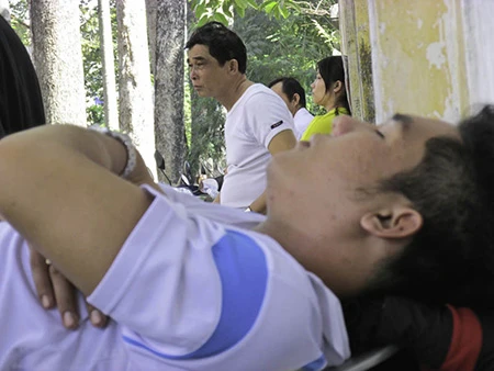Qua nhiều ngày “tiếp sức”, nhiều phụ huynh đã mệt mỏi, mắt thâm quầng… Và họ đã tranh thủ chọp mắt khi con em mình vào phòng thi - Ảnh: Phước Tĩnh