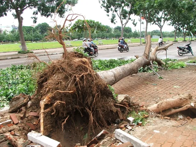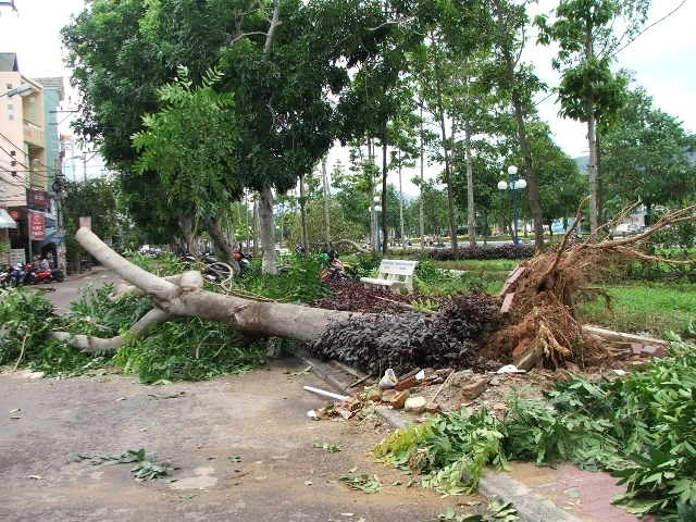 Bão đánh ngã đổ hàng loạt cây xanh trên đường phố Quy Nhơn.