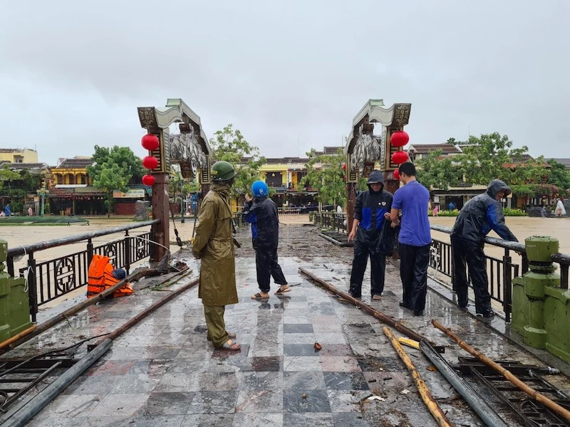 Lực lượng chức năng túc trực 100% tại cầu An Hội khơi thông dòng chảy, chuẩn bị đối phó với lũ.