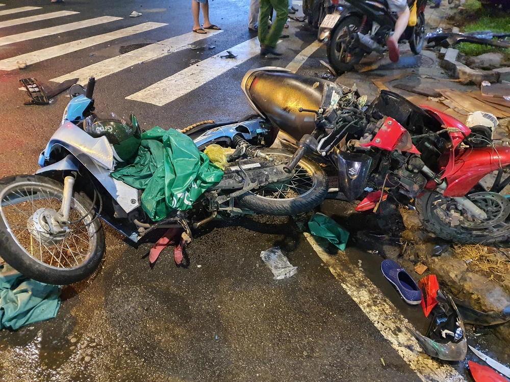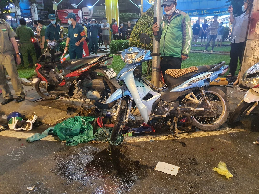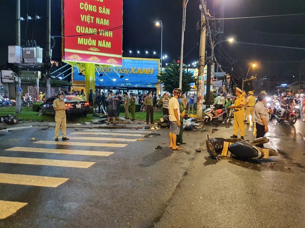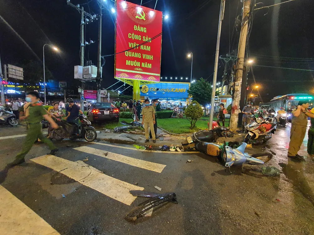 Tại hiện trường các xe máy của nạn nhân nằm la liệt, nhiều mảnh vỡ văng khắp nơi. Riêng chiếc ô tô bị hư hỏng nặng phần đầu, mắc kẹt vào trụ điện ở đài liệt sĩ.