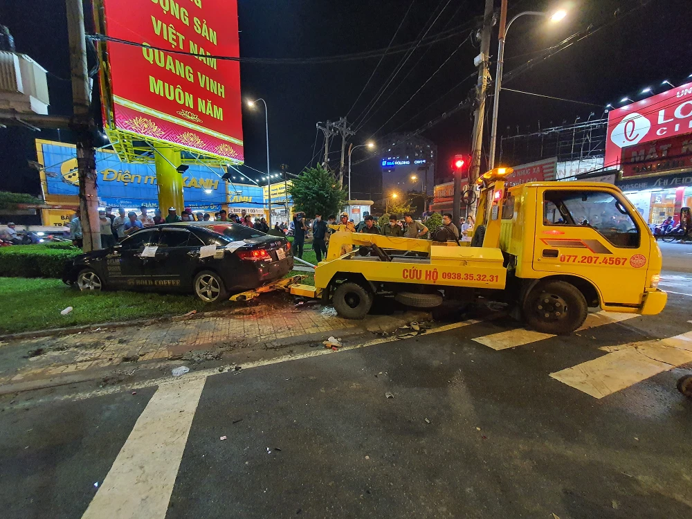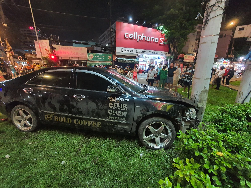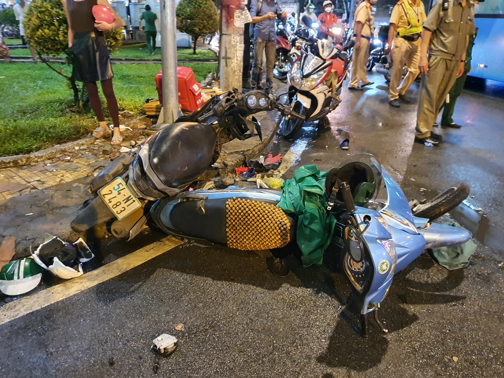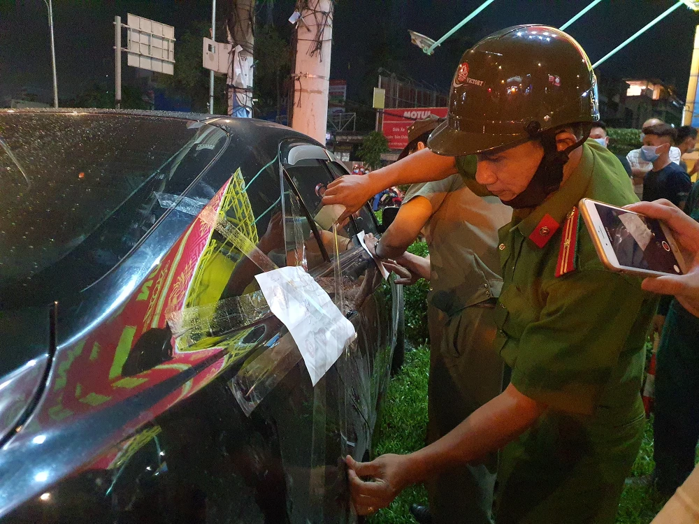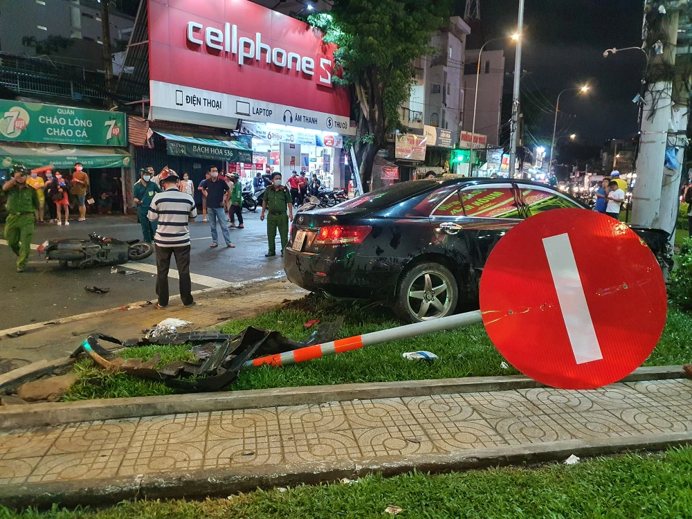 Tại hiện trường các xe máy của nạn nhân nằm la liệt, nhiều mảnh vỡ văng khắp nơi. Riêng chiếc ô tô bị hư hỏng nặng phần đầu, mắc kẹt vào trụ điện ở đài liệt sĩ.