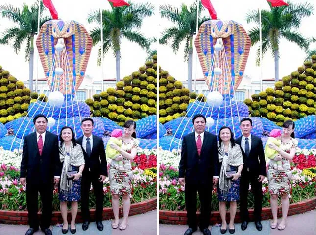 Gia đình ông Nguyễn Bá Thanh chụp hình lưu niệm tại biểu tượng của năm Quý Tỵ, bên cạnh là vợ ông và vợ chồng con trai Nguyễn Bá Cảnh
