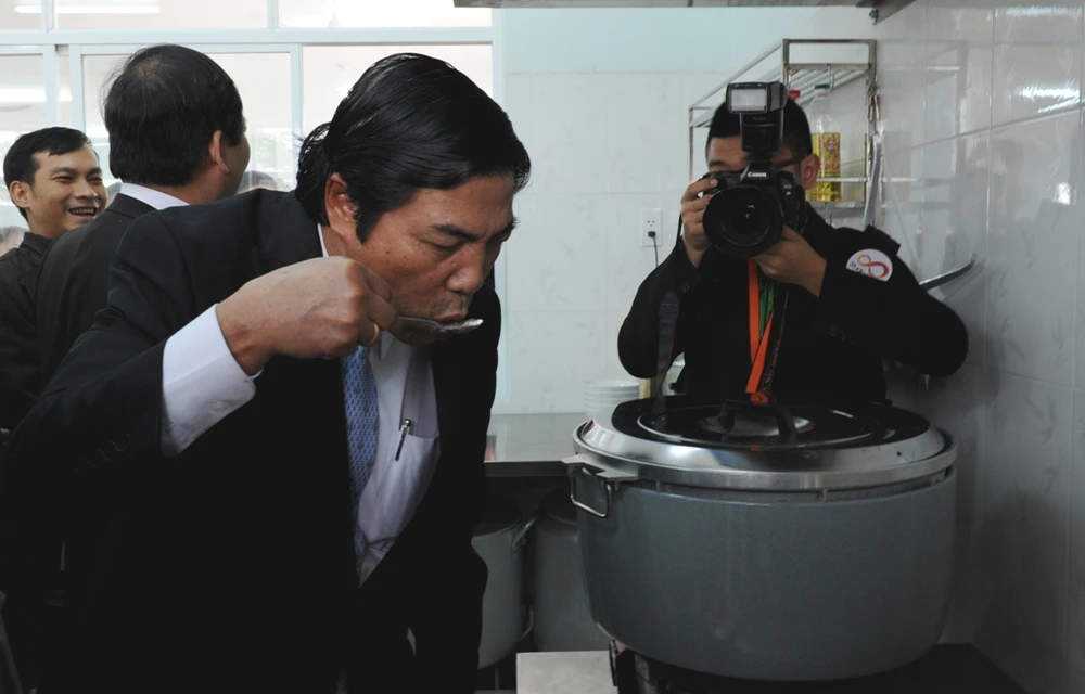 Ông Thanh húp thử cháo phát miễn phí tại bệnh viện xem ngon dở thế nào, từ đó ông đã có những chỉ đạo đối với bếp ăn tại bệnh viện ung thư miễn phí cho người nghèo