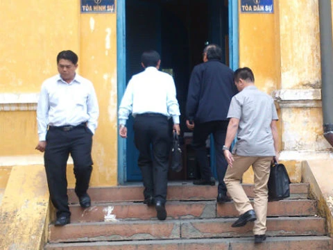 Ông Nguyễn Bá Thanh (mặc áo đen) đến dự phiên tòa xử siêu lừa Huỳnh Thị Huyền Như chiều ngày 15/1/2014. Ảnh: NLĐO.