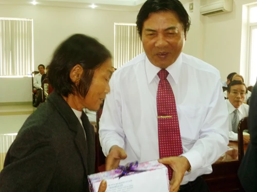Ông Nguyễn Bá Thanh tặng quà cho bà Trần Thị Minh Nguyệt, phụ nữ nghèo bị bệnh ung thư vú được Hội Bảo trợ Phụ nữ và Trẻ em nghèo bất hạnh TP Đà Nẵng hỗ trợ chữa bệnh miễn phí