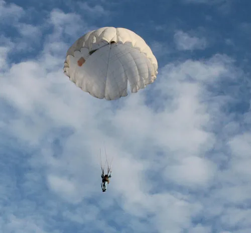 Họ phải đeo trên mình hai loại dù: dù chính và phụ.Loại dù chính nằm phía sau lưng, còn dù phụ ở trước bụng. Trước khi nhảy, học viên đã móc dây dù mồi vào máy bay, khi nhảy ra khỏi cửa thì dù mồi được mở ra ngay lập tức và rơi tự do khoảng 3 giây sau thì học viên sẽ giật khóa dù chính và dù mồi sẽ tự động lôi dù chính mở ra.