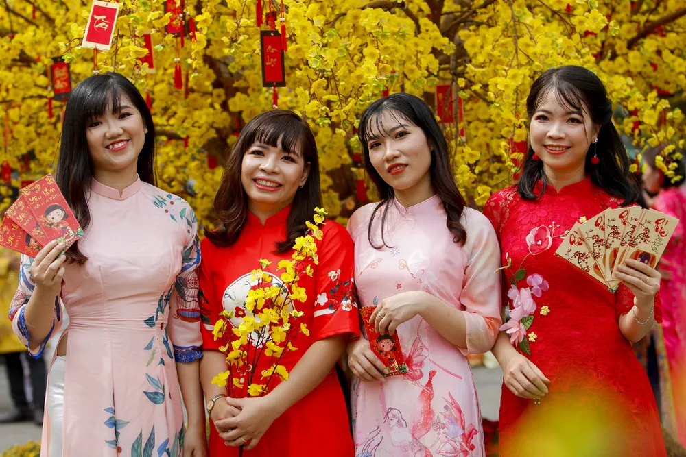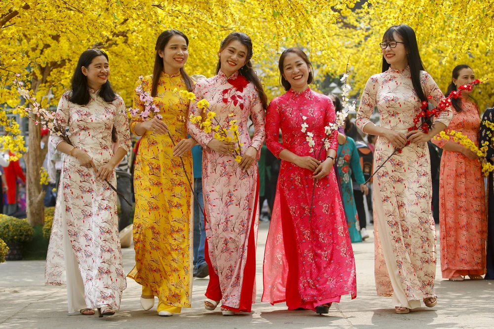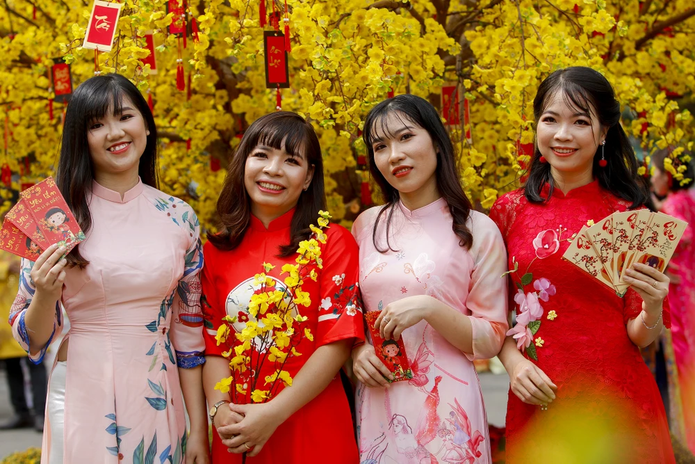 Nhiều nhóm bạn trẻ diện áo dài xuống phố ghi lại khoảnh khắc trước năm mới Tân Sửu.