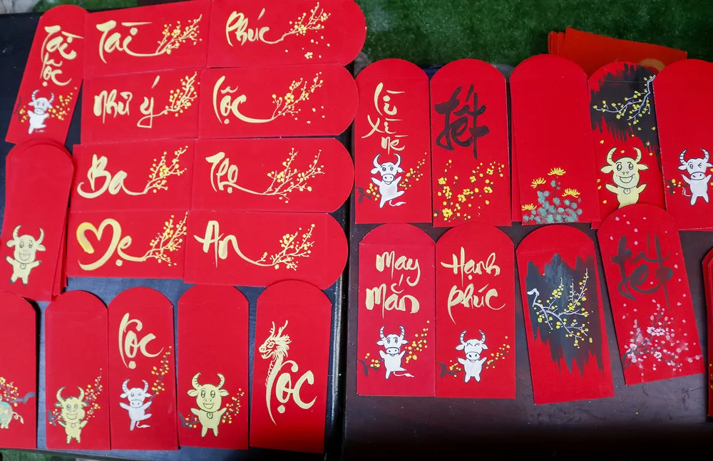 Bao lì xì được vẽ với nhiều chữ mang ý nghĩa tốt lành, cầu chúc mọi sự tốt đẹp trong năm mới.