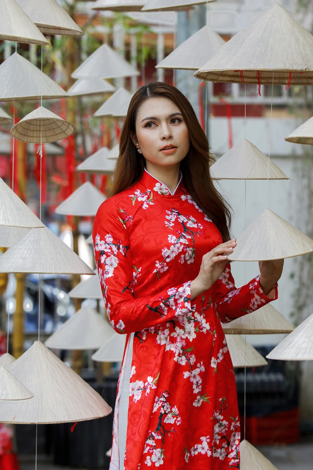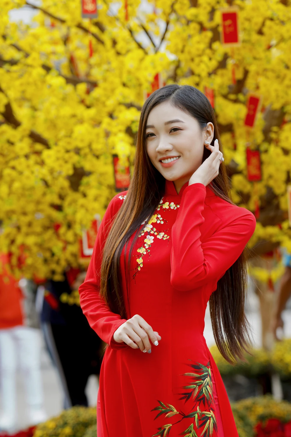 Chị Hồng Thu chọn cho mình áo dài đỏ, với mái tóc dài, làm mẫu cho các nhiếp ảnh gia sáng tác.