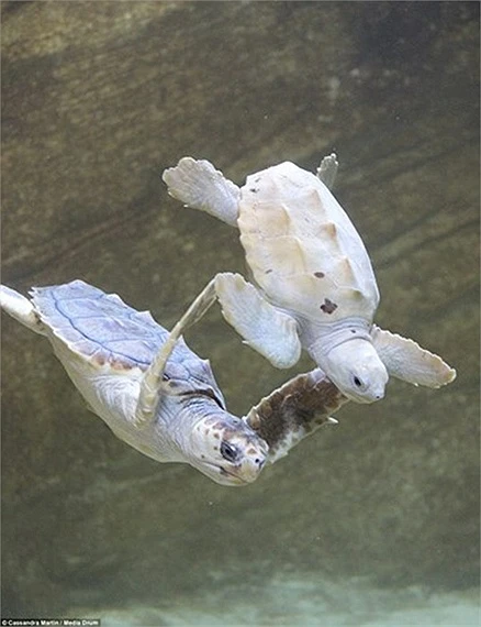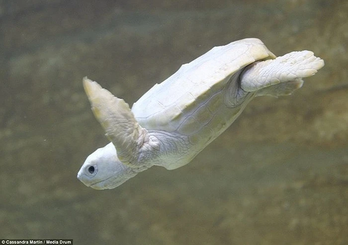 Rùa Alba được bao phủ toàn bộ cơ thể bởi một màu trắng tinh, nó đang thỏa sức bơi trong nước do vừa được tập bơi.