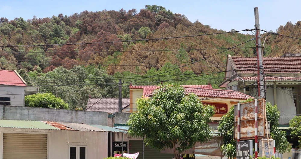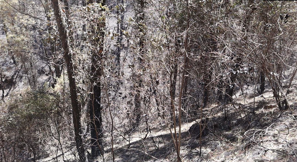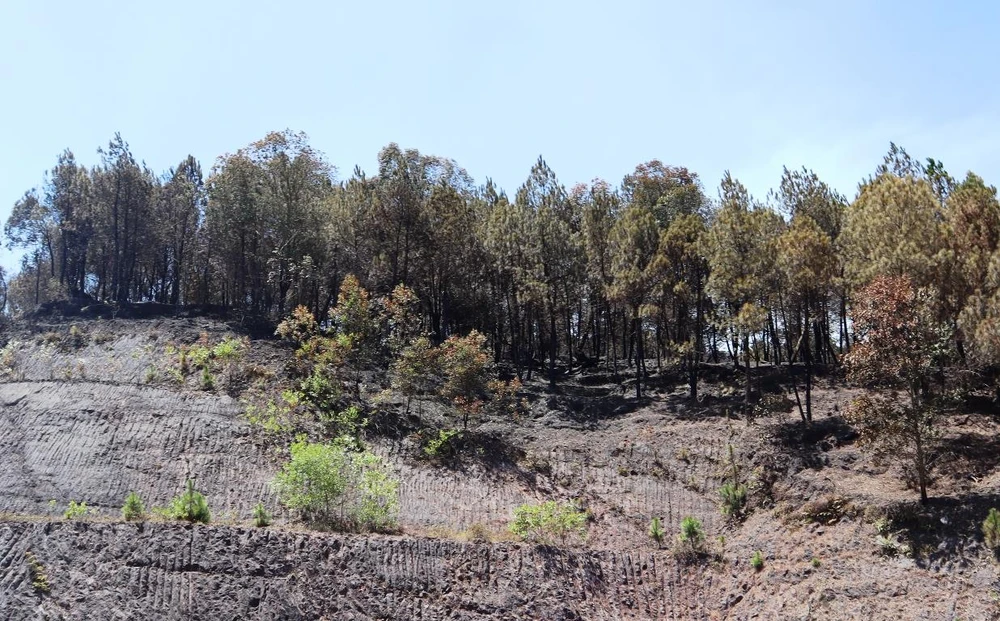 Thảm thực bì cháy hết để lại những cây thông như chết đứng trên núi Hồng Lĩnh. Ảnh: Đắc Lam