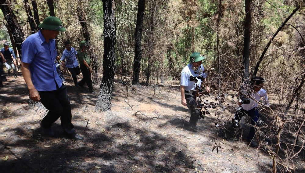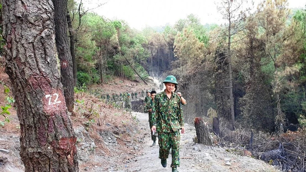 Lực lượng chức năng đang phải tục trực, canh gác, tuần tra đề phòng lửa bùng trở lại trên núi Hồng Lĩnh. Ảnh: Đắc Lam