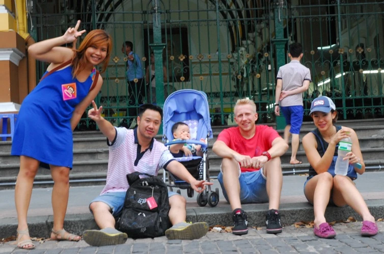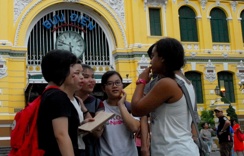 Các bạn trẻ học giao tiếp ngoại ngữ với khách du lịch