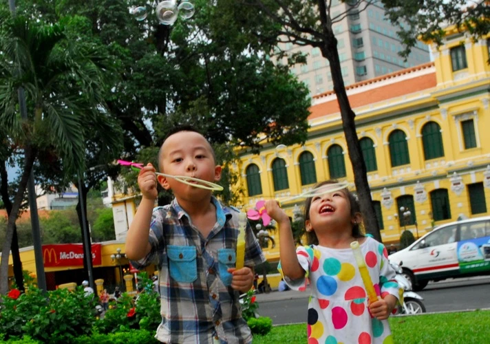 Các em bé vui đùa hồn nhiên, thả hồn theo từng chùm bong bóng xà phòng rực rỡ