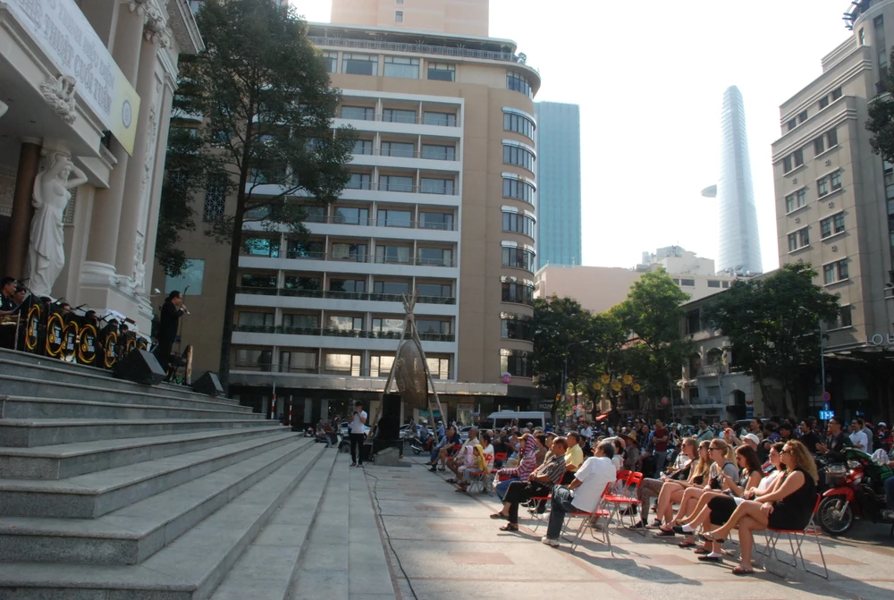 Tại khu vực Nhà hát TPHCM, ngay từ rất sớm, rất nhiều người dân và du khách hào hứng với chương trình biểu diễn nghệ thuật của nhạc sĩ Trần Mạnh Tuấn do Sở VHTTDL và Nhạc Viện TPHCM tổ chức.