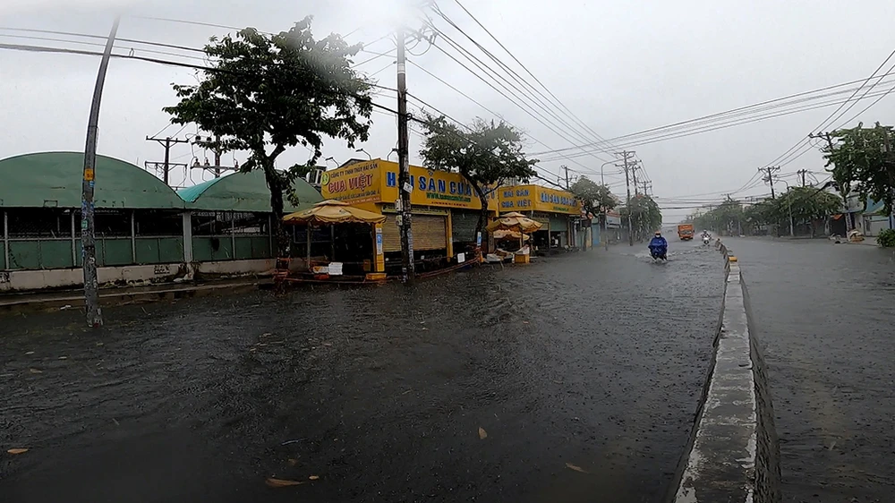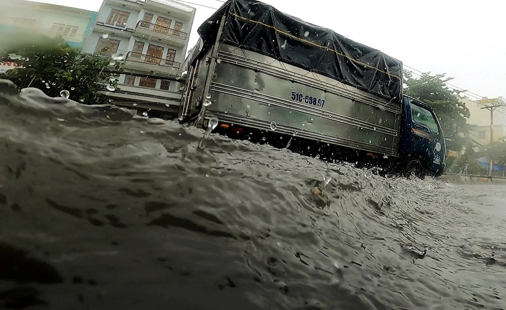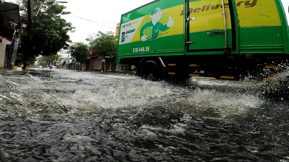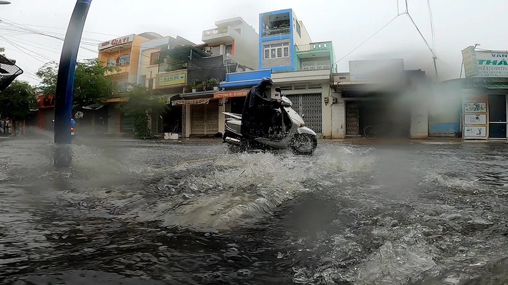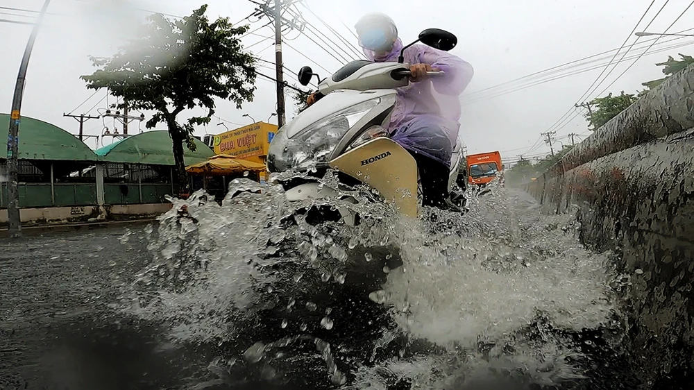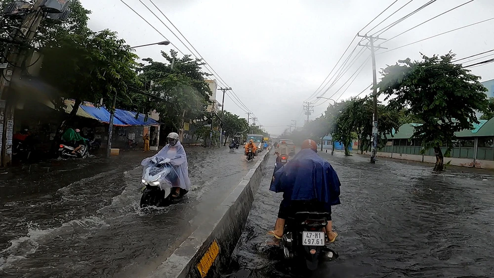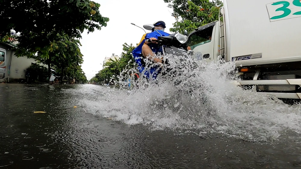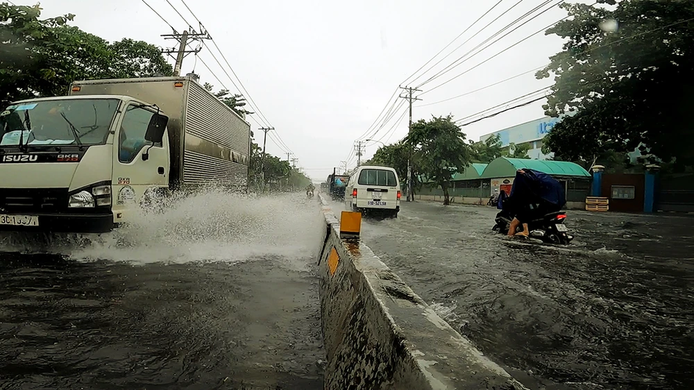 Trên đường Song Hành đoạn qua phường Tân Hưng Thuận cũng bị ngập nhẹ trong cơn mưa. Sau khoảng 30 phút mưa ngớt, đường bắt đầu rút nước và giao thông đi lại bình thường. Ảnh NT