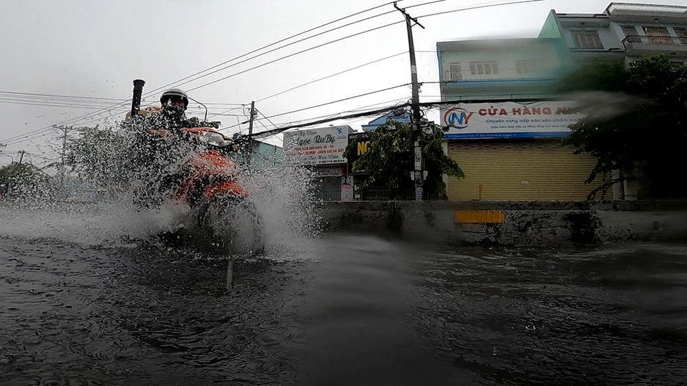 Trận mưa lớn trưa ngày 12-8 đã khiến nhiều tuyến đường ở quận 12, TP.HCM bị ngập. Ảnh NT