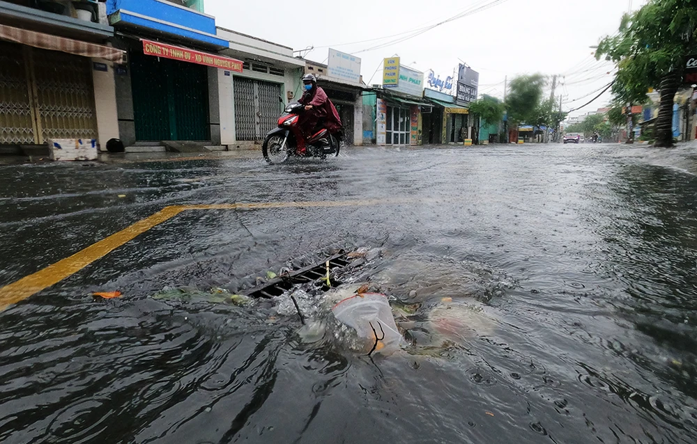 Do mưa lớn, hệ thống cống trên các tuyến đường bị ngập không tiêu thoát kịp. Ảnh NT