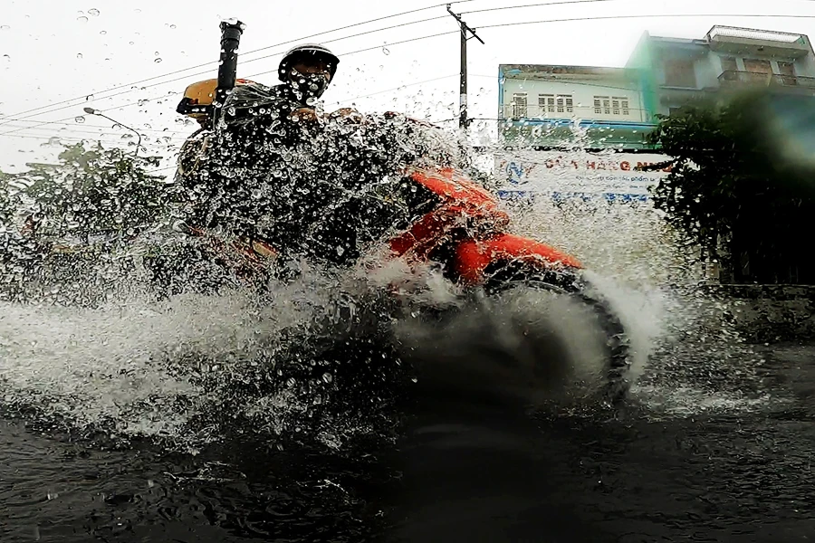 Mỗi khi có xe máy hay ô tô lưu thông tốc độ cao thì nước bắn tung tóe khắp nơi. Ảnh NT