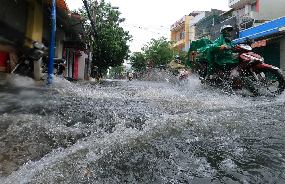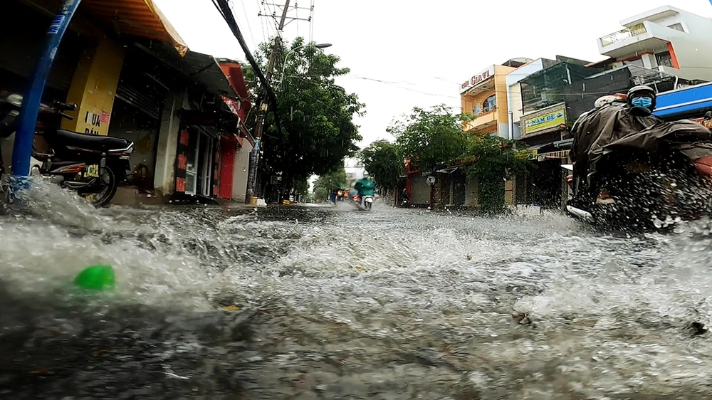 Đường ngập khiến việc lưu thông của người dân gặp khó khăn. Ảnh NT