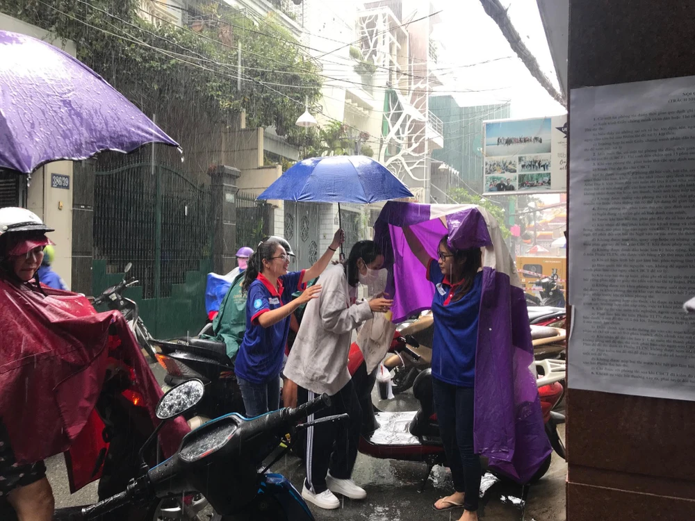 Tình nguyện viên che dù, áo mưa hỗ trợ các thí sinh vào phòng thi.