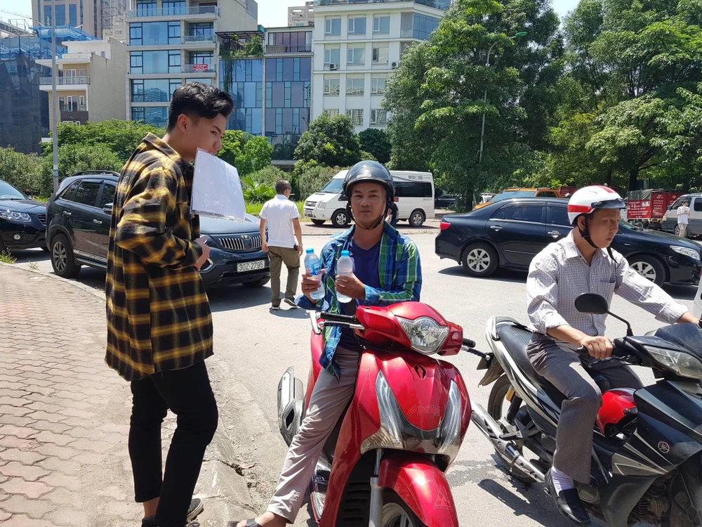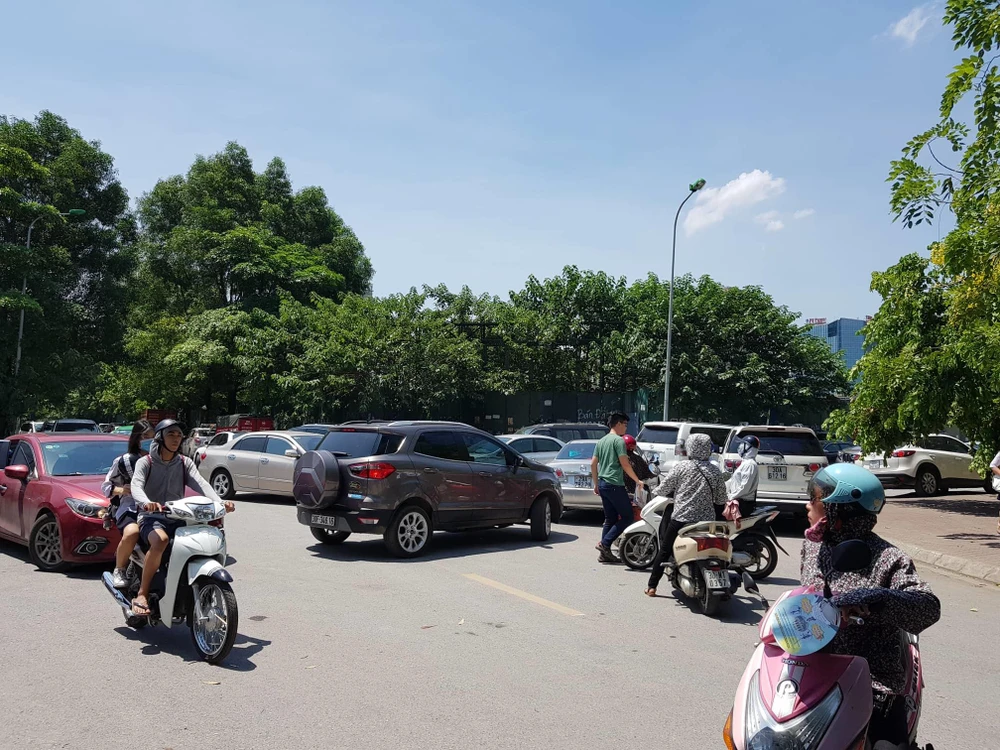 Nắng nóng, nhiều gia đình có điều kiện đưa con đi thi bằng ô tô dẫn đến kẹt xe nhẹ tại điểm thi THCS-THPT Lương Thế Vinh.