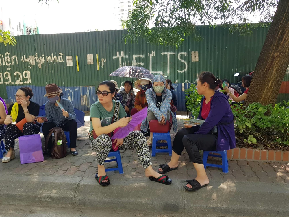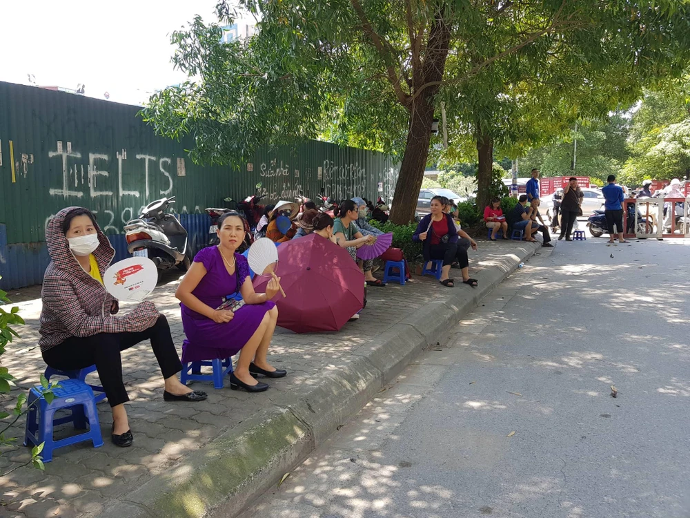 Hơi nóng bê tông bốc lên hừng hực, khiến các bà các mẹ ngồi đợi con cũng mệt mỏi, có người mang cả quạt mini theo để chống nóng