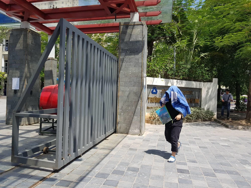 Phụ huynh bịt kín mặt chống nắng tại điểm thi THCS Bạch Đằng, TP.HCM.