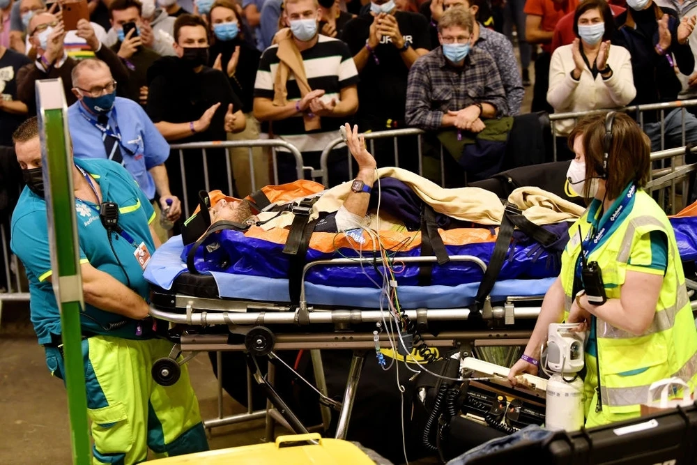Sau đó Cavendish được đưa lên cáng cứu thương chuyển đến bệnh viện. Trước khi rời nhà thi đấu Madison, Cavendish còn vẫy tay chào tạm biệt khán giả. ẢNH: GETTY