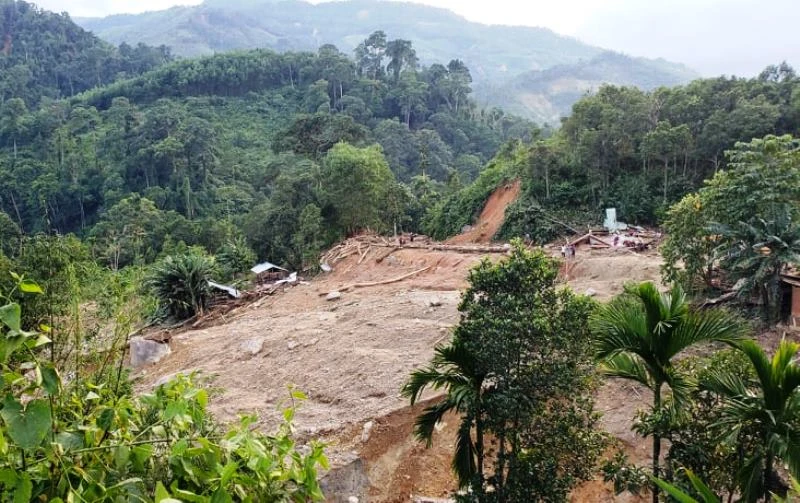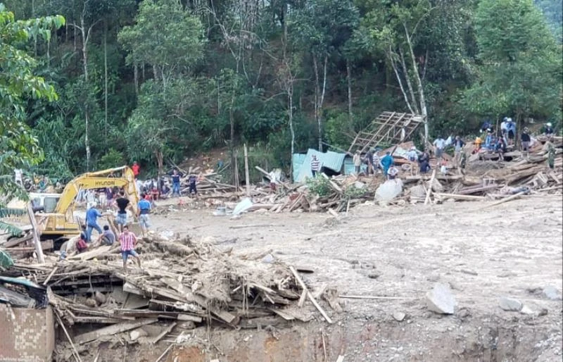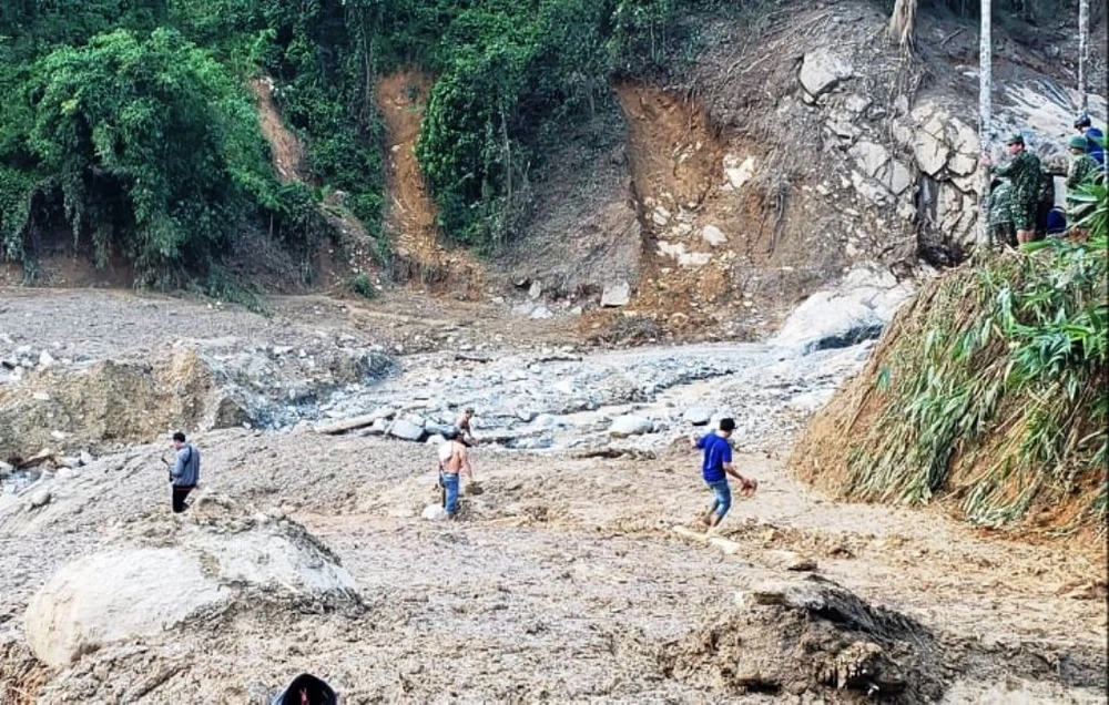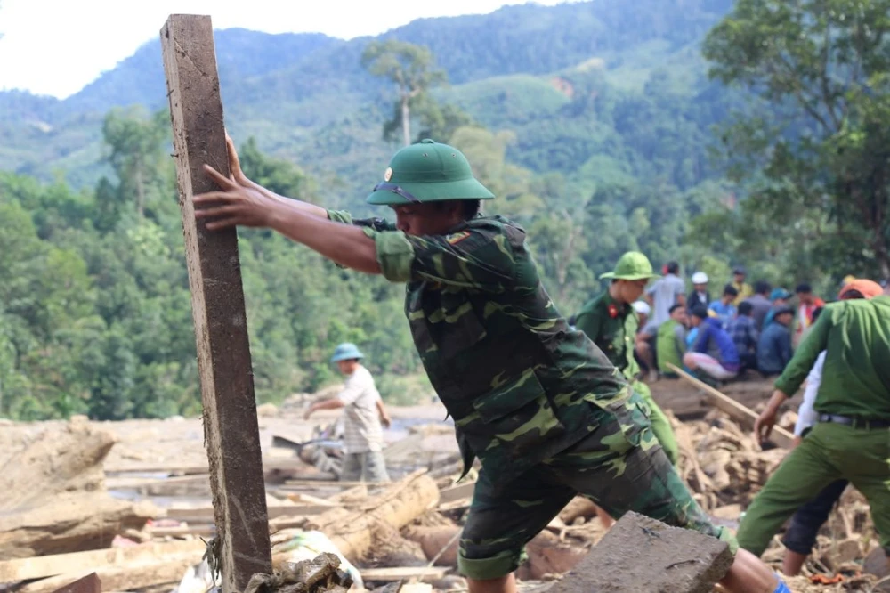Tại vị trí có nhà dân, những mái tôn lộ lổn ngổn trong bùn đất và cây cối. Lực lượng chức năng tích cực tìm kiếm những nạn nhân mất tích.