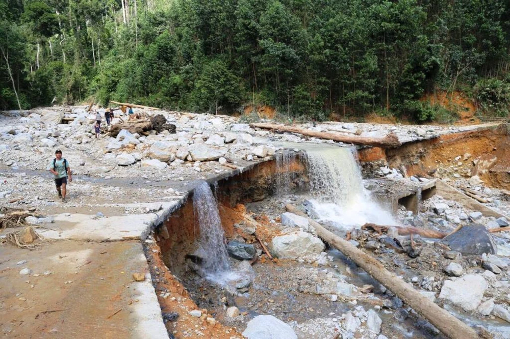 Bộ đội liên tục khiêng vác đồ cứu trợ đến hiện trường. Hiện trường cách trung tâm huyên Bắc Trà My khoảng 50 km, với nhiều điểm sạt lở