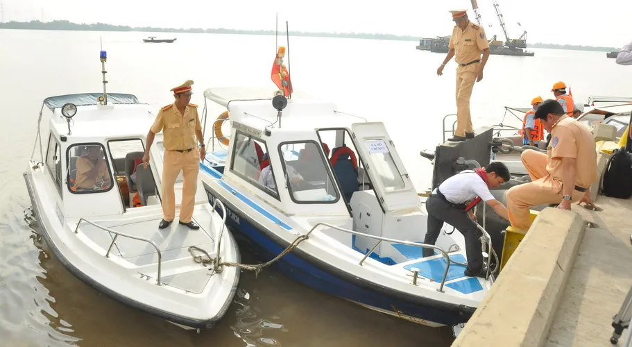 CSGT tỉnh Long An cũng tham gia hỗ trợ, điều tiết các phương tiện thủy nội địa tránh khỏi luồng tàu biển. Ảnh: MP