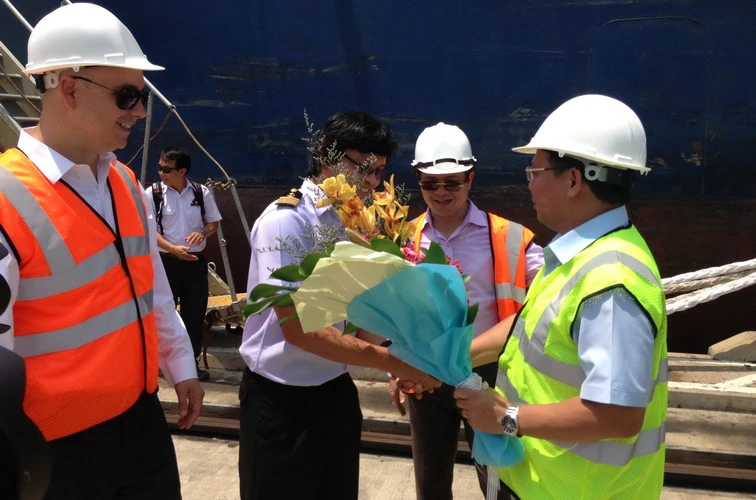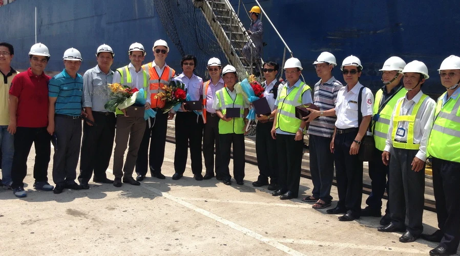 Chụp hình lưu niệm với thuyền trưởng, hoa tiêu đã lần đầu tiên điều khiển tàu 30.000 tấn lưu thông an toàn trên luồng Soài Rạp. Ảnh: MP