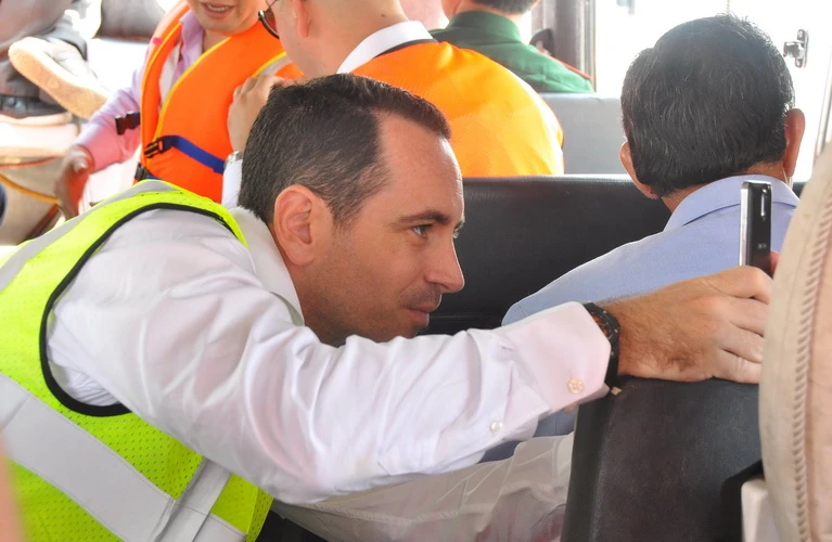 Trên một tàu chỉ huy, ông Boris, Tổng Giám đốc hãng tàu MSC ghi lại những khoảng khắc đầu tiên chiếc tàu chuẩn bị cập cảng SPCT thông qua luồng Soài Rạp. Ảnh: MP
