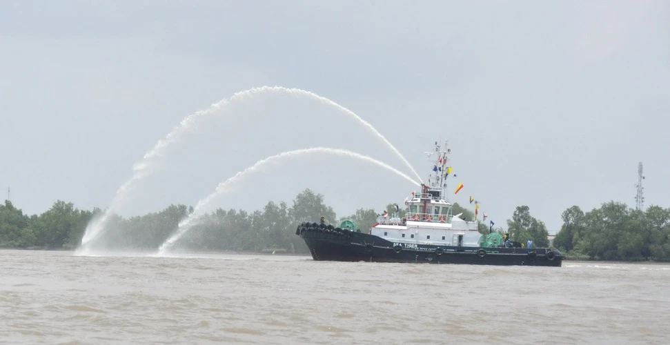 Một chiếc tàu lai dắt từ bên trong chạy ra ngoài phun nước đón tàu biển. Ảnh: MP