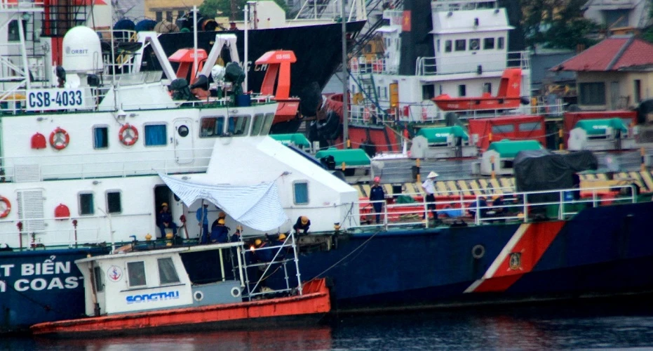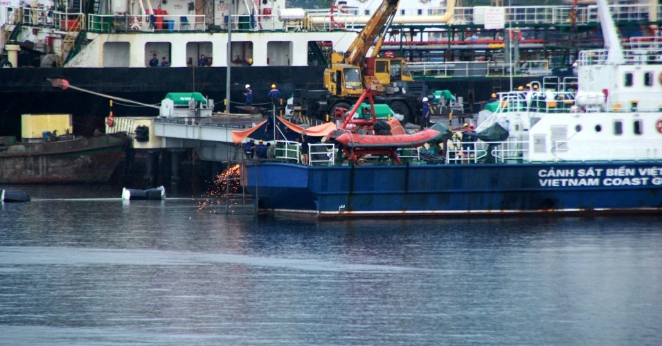 Công việc sửa chữa được tiến hành rất hối hả với nhiều tốp cán bộ, kỹ thuật, thợ máy thay nhau khắc phục các hưu hỏng sau khi bị các tàu của Trung Quốc liên tiếp húc vào thân, gây hư hỏng.