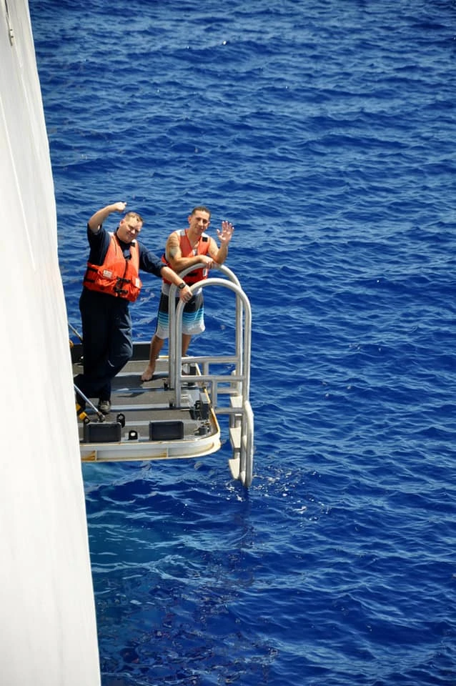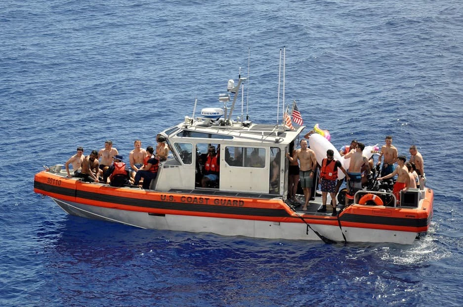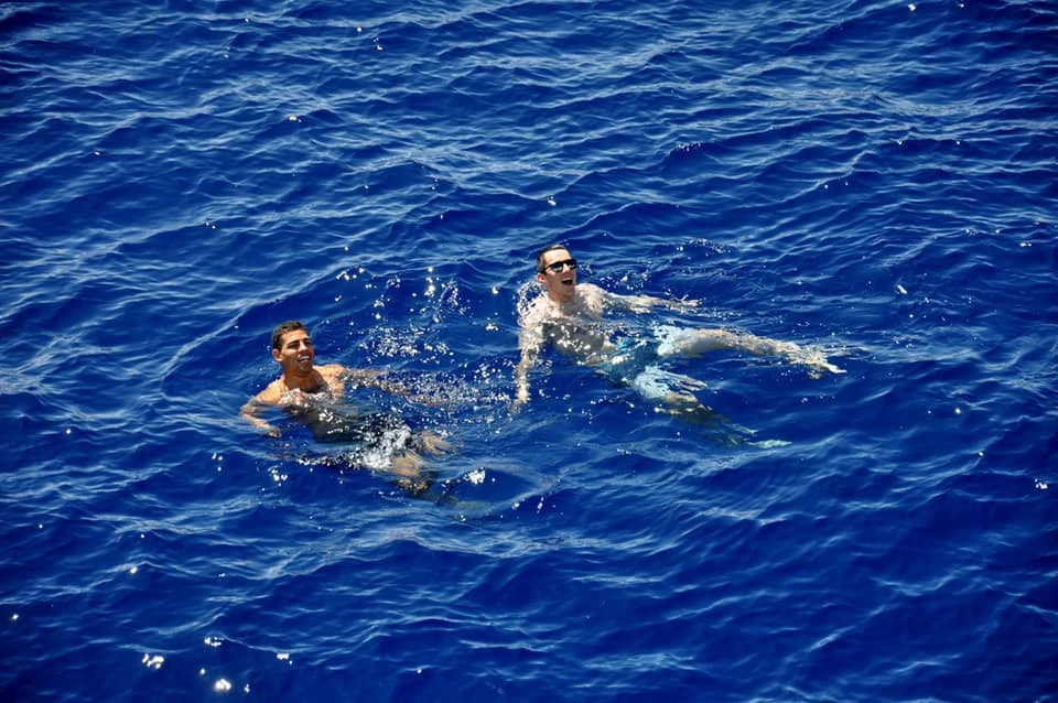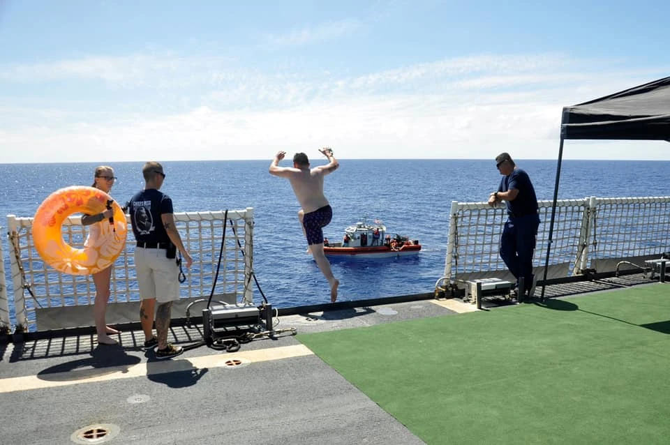Các thủy thủ trên tàu USCGC Kimball lớp Legend của lực lượng bảo vệ bờ biển Mỹ đã cùng tổ chức một sự kiện bơi sau khi hoàn tất công việc của ngày, theo thông tin viết trên trang Facebook của tàu ngày 25-8.