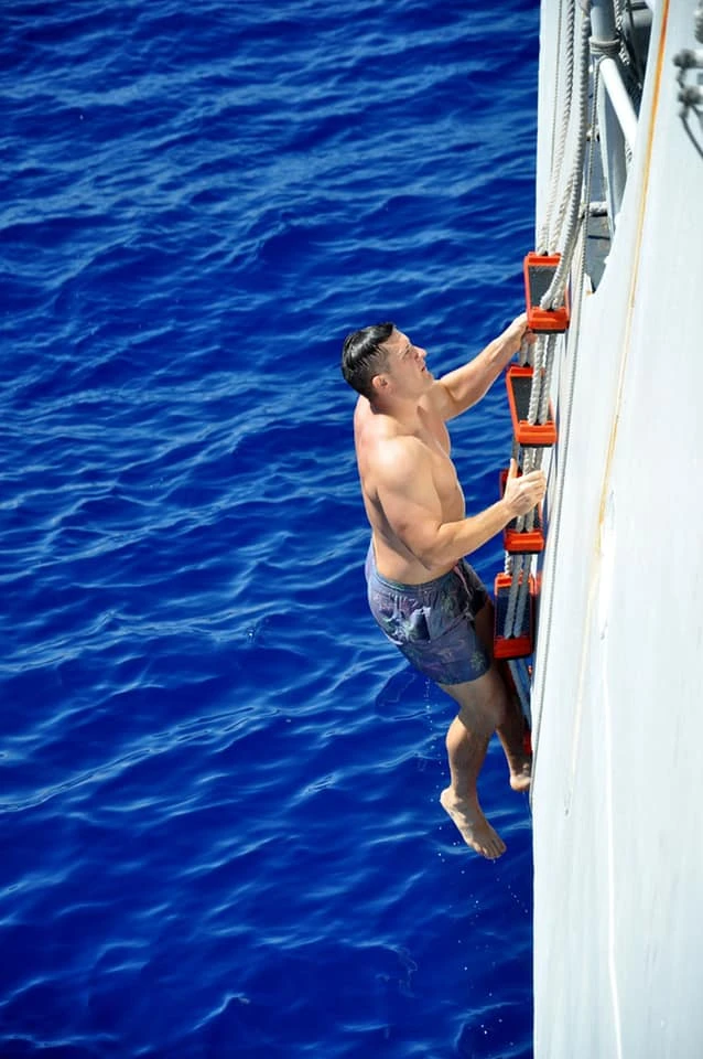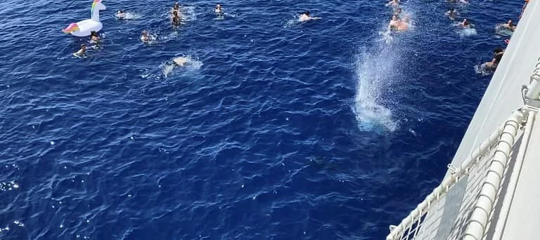 “Sau khi hoàn tất các hoạt động của ngày, trong bối cảnh không có tàu thuyền nào xung quanh đó hàng dặm, thời tiết hoàn hảo, chúng tôi cách đất liền rất xa, chúng tôi chưa rời khỏi tàu hàng tuần liền, mỗi ngày đều như ngày trú ẩn, và chúng tôi quyết định làm điều gì đó phá vỡ sự buồn tẻ. Câu trả lời là: Bơi!” – theo thông tin viết trên trang Facebook tàu USCGC Kimball.