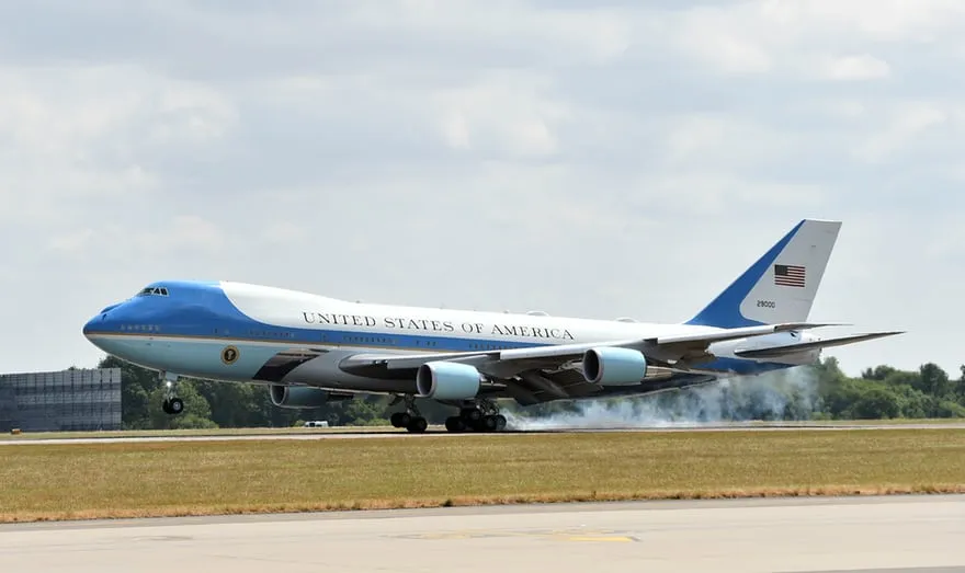 Chiếc phi cơ Air Force One, chở tổng thống Mỹ Donald Trump cùng phu nhân hạ cánh xuống sân bay Stansted. Anhr: AFP