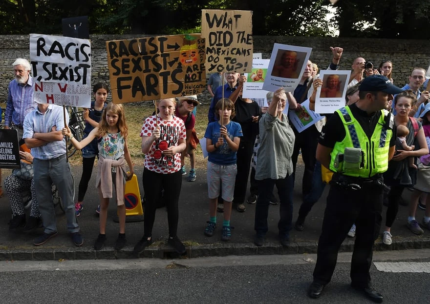 Tuy nhiên, trái với sự chào đón nhiệt tình từ nữ thủ tướng, một số người Anh phản đối chuyến thăm của ông Trump. Ảnh: AFP