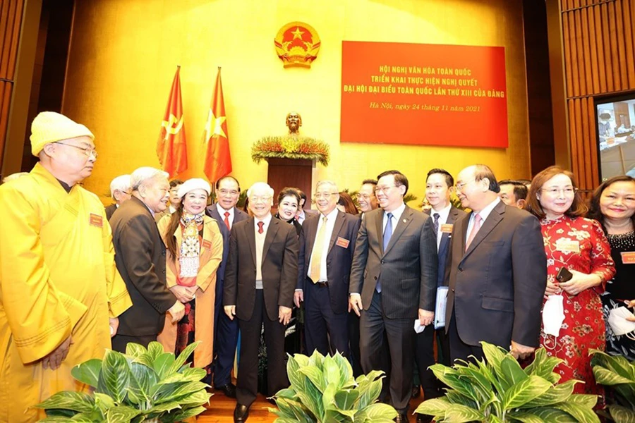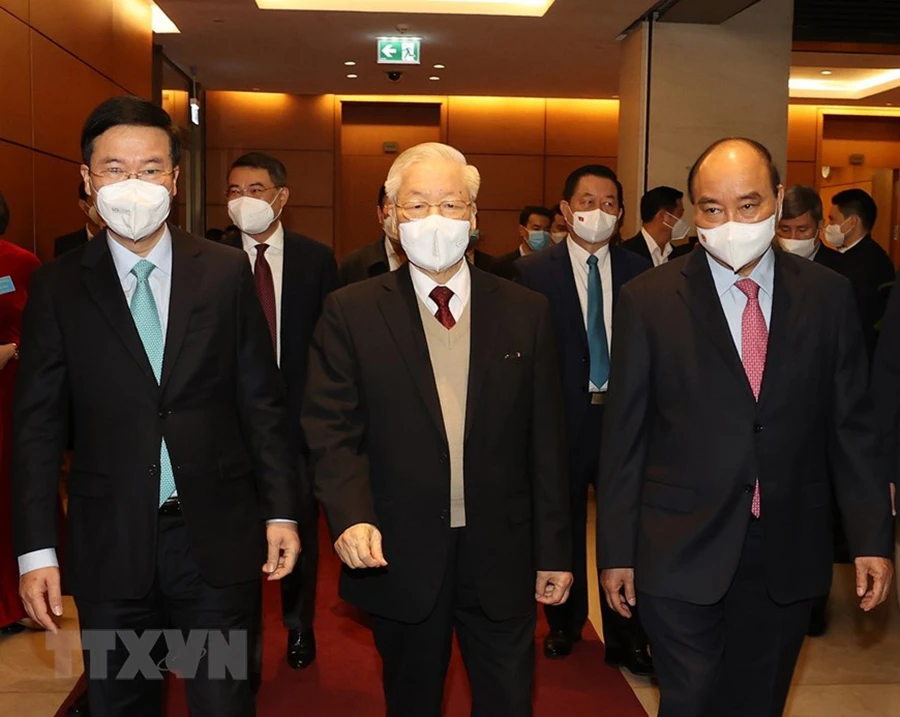 Tổng Bí thư Nguyễn Phú Trọng, Chủ tịch nước Nguyễn Xuân Phúc, Thường trực Ban bí thư Võ Văn Thưởng cùng các vị lãnh đạo Đảng, Nhà nước và các đại biểu dự hội nghị.